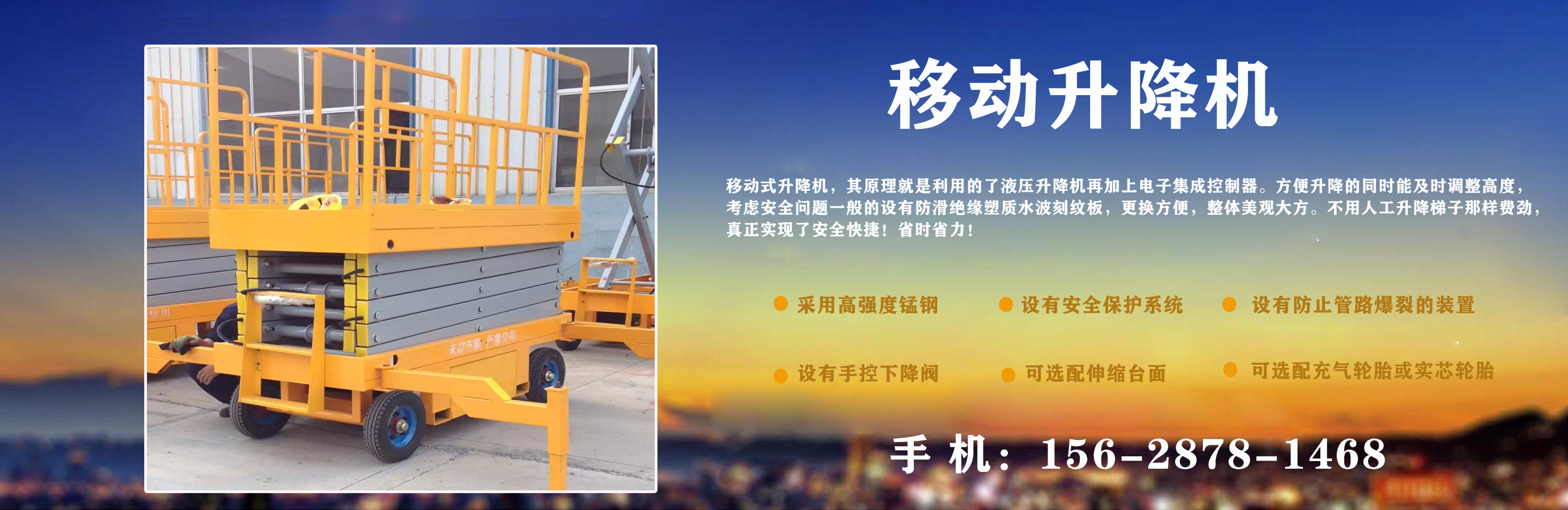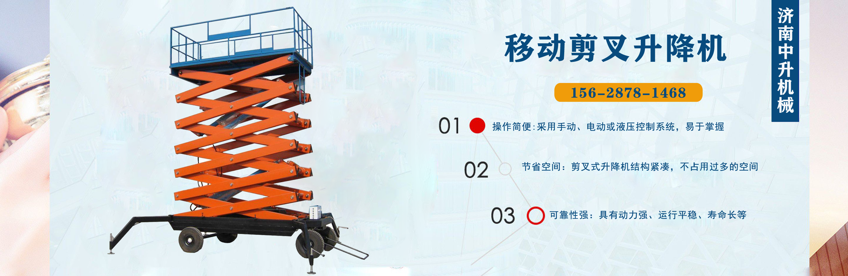 濟(jì)南中升機(jī)械制造有限公司主營移動升降機(jī),小型移動升降機(jī),移動式升降機(jī),移動剪叉升降機(jī),移動剪叉式升降機(jī)等產(chǎn)品,信譽(yù)良好,歡迎前來咨詢訂購!  在銷售上,尊重每一個(gè)客戶,做到保質(zhì)、保量及時(shí)供貨;在售后服務(wù)上,以較短的時(shí)間,用較快的速度解決,終身追蹤服務(wù)。  公司始終以“品質(zhì)為本,服務(wù)至上”為公司宗旨。致力于提供高品質(zhì)的產(chǎn)品,完善的服務(wù),快捷的供貨,無論您身處何方,都能感受到我們的優(yōu)良服務(wù)。客戶至上,誠信為本。  歡迎各界朋友來電,來函垂詢,選購!...